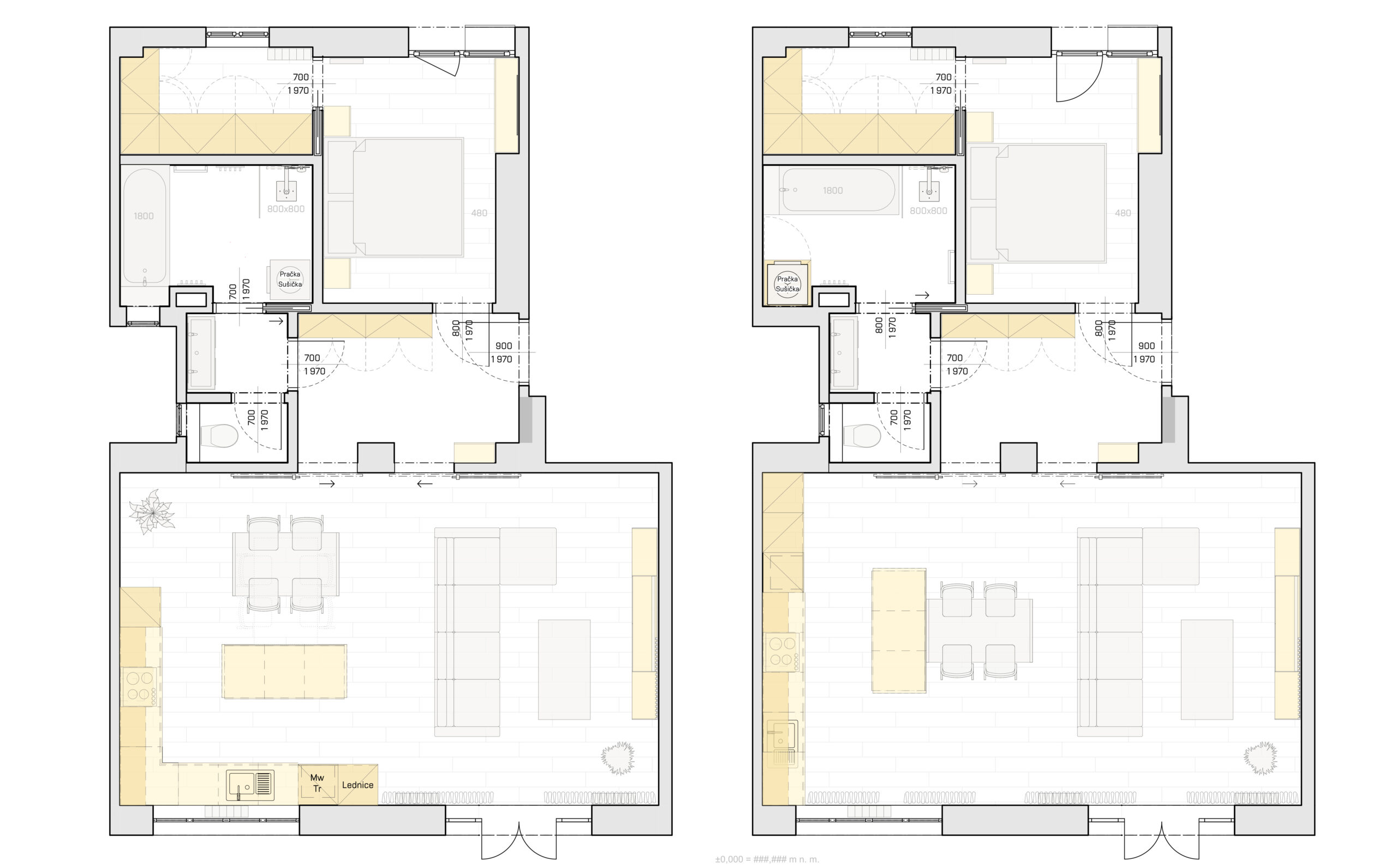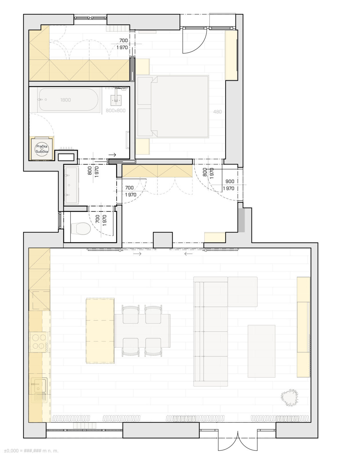 Zadáním byl vznik velkého obývacího pokoje s kuchyní a vznik jedné ložnice se samostatnou šatnou. Hlavní důvod rekonstrukce bylo zajištění velké koupelny se samostatným WC.